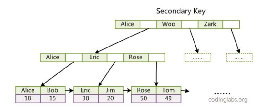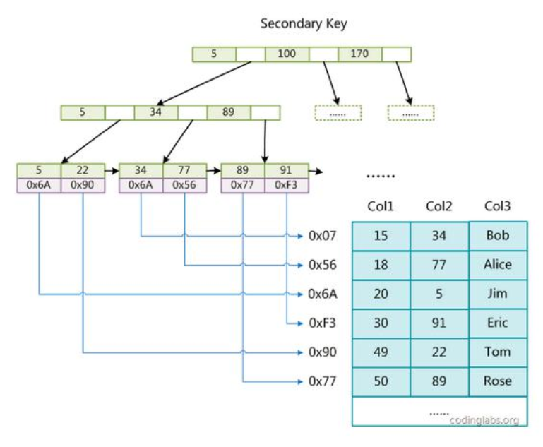 是主索引要求 key 是唯一的,而辅助索引的 key 可以重复。如果我们在 Col2 上建立一个辅助索引,则此索引的结构如下图所示