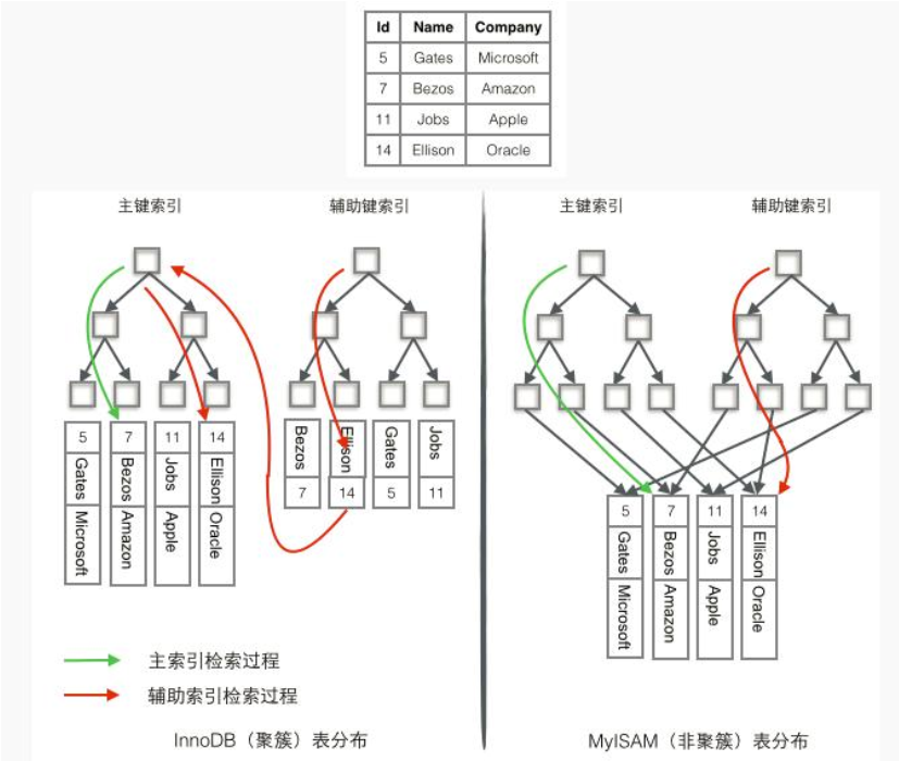 为了更形象说明这两种索引的区别, 我们假想一个表如下图存储了 4 行数据。 其中Id 作为主索引, Name 作为辅助索引。 图示清晰的显示了聚簇索引和非聚簇索引的差异