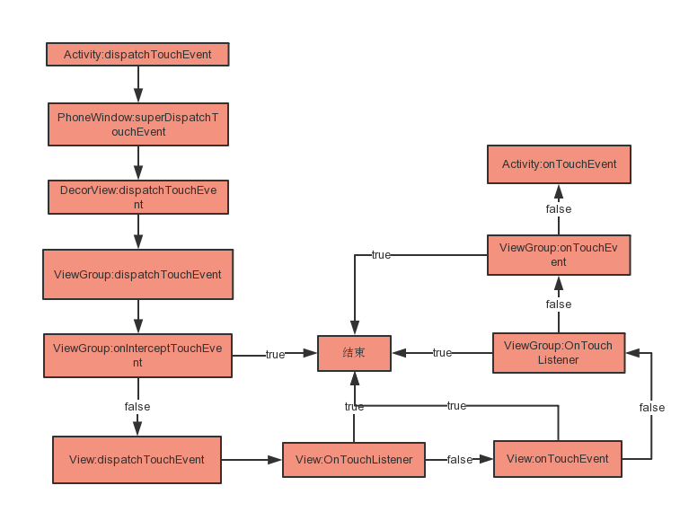 - ViewGroup中的dispatchTouchEvent方法,负责把事件分发给子View,如果没有子View,就自己处理了