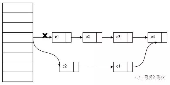 假设我们的链表元素是:e1-> e2 -> e3 -> e4 我们要删除 e3这个entry,因为HashEntry中next的不可变,所以我们无法直接把e2的next指向e4,而是将要删除的节点之前的节点复制一份,形成新的链表。