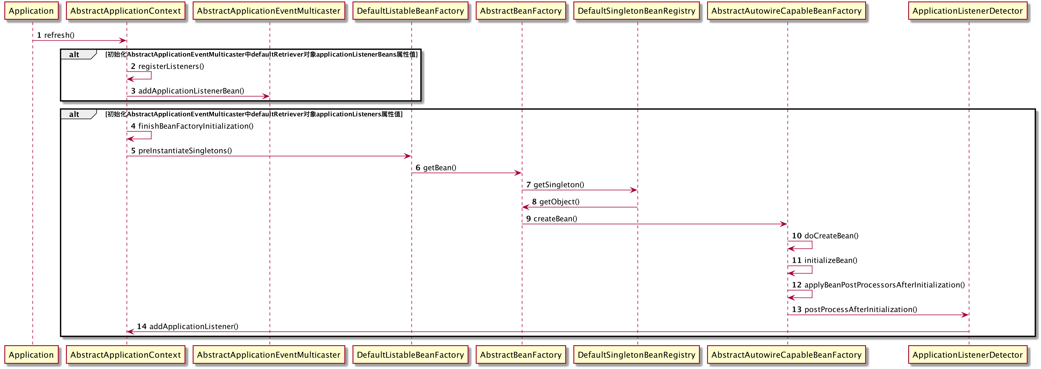 在调用阶段时序图5中得知符合对应事件的监听者是从 AbstractApplicationEventMulticaster 成员 (ListenerRetriever)defaultRetriever 的 applicationListeners 和 applicationListenerBeans 属性获取的。组装阶段就是解析 defaultRetriever 初始化负值过程。