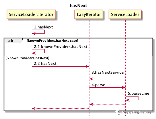 在调用完ServiceLoader的iterator方法之后,会遍历元素(不管是for循环还是逐个迭代),由hasNext和next结合使用来实现: