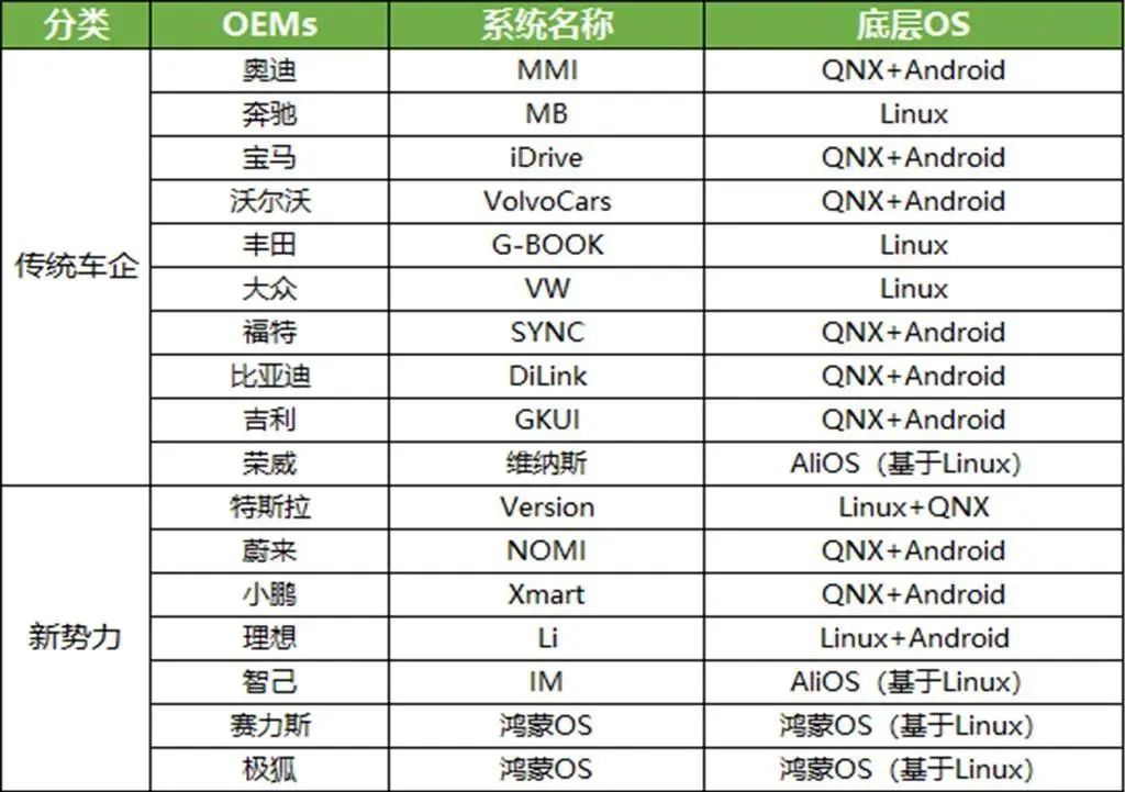 站在车企角度,国外车企更青睐谷歌、QNX、微软等厂商;而国内车企的智能化程度尚在起步,缺乏对接生态的能力。目前,基于QNX、Linux、安卓三大阵营的车载系统已经包揽了全部市场份额。