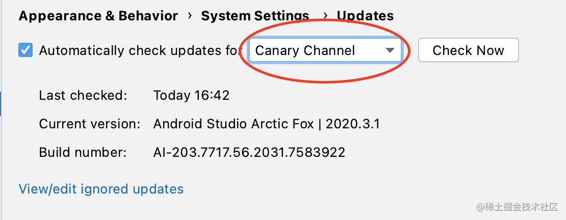 - 1.在Preferences(Windows下是Settings) -> Appearance&Behavior -> System Settings ->Updates 中将检查更新的channel改为
