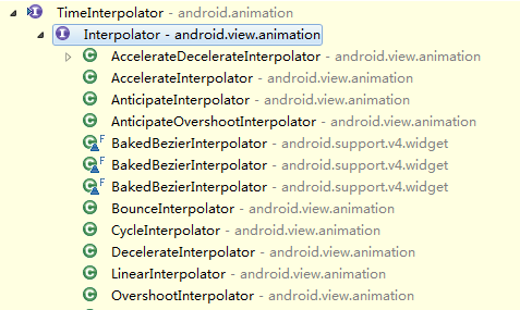 很容易发现Android系统中在处理动画的时候会调用插值器中的getInterpolation(float input)方法来获取当前的时间点,依次来计算当前变化的情况。这就不得不说到Android中的插值器Interpolator,它的作用是根据时间流逝的百分比来计算出当前属性值改变的百分比,系统预置的有LinearInterpolator(线性插值器:匀速动画)、AccelerateDecelerateInterpolator(加速减速插值器:动画两头慢中间快)和DecelerateInterpolator(减速插值器:动画越来越慢)等,如图: