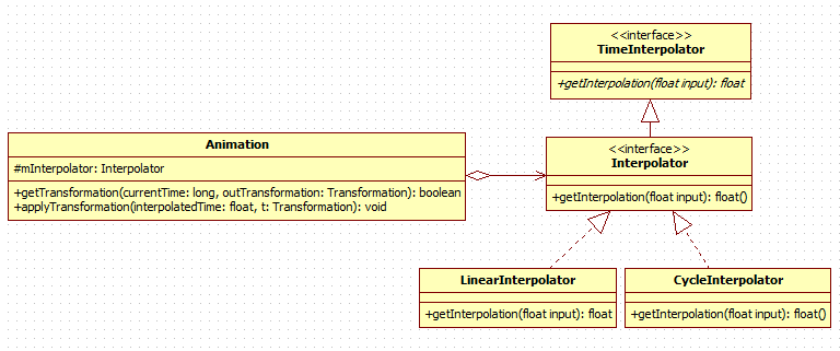 由于初期比较旧的版本采用的插值器是TimeInterpolator抽象,google采用了多加一层接口继承来实现兼容也不足为怪了。很显然策略模式在这里作了很好的实现,Interpolator就是处理动画时间的抽象,LinearInterpolator、CycleInterpolator等插值器就是具体的实现策略。插值器与Animation的关系图如下: