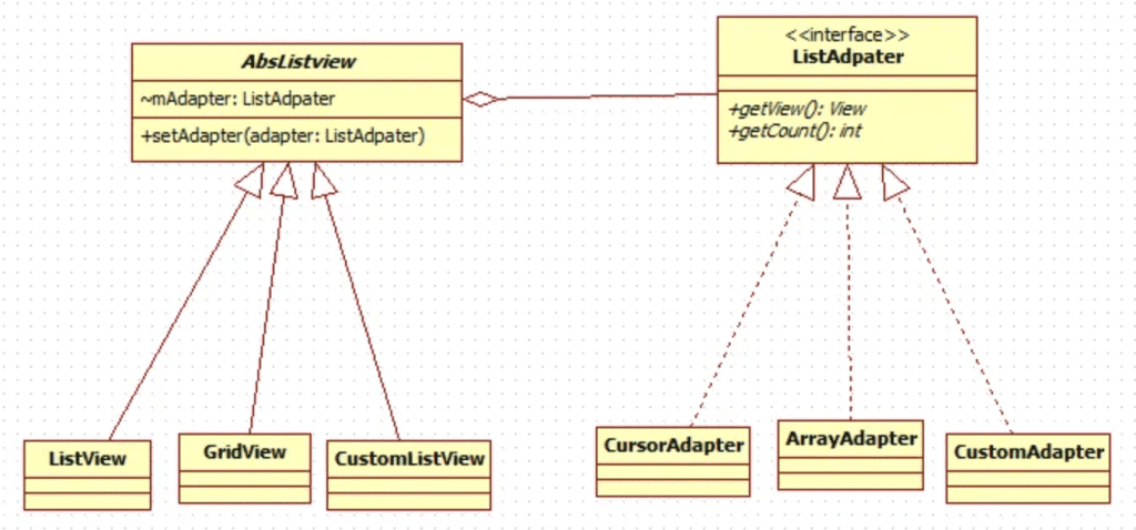 在Android中也运用到了Bridge模式,我们使用很多的ListView和BaseAdpater其实就是Bridge模式的运行,很多人会问这个不是Adapter模式,接下来根据源码来分析。