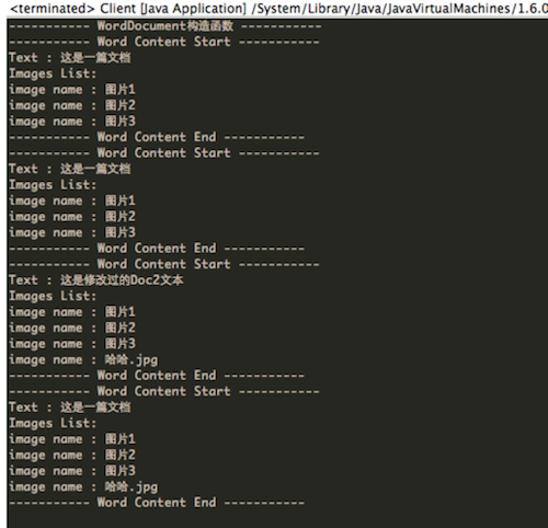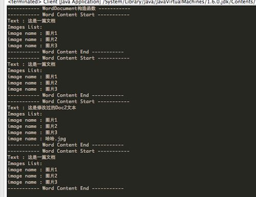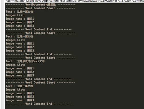 通过WordDocument类模拟了word文档中的基本元素,即文字和图片。WordDocument的在该原型模式示例中扮演的角色为ConcretePrototype, 而Cloneable的角色则为Prototype。WordDocument实现了clone方法以实现对象克隆。下面我们看看Client端的使用 :