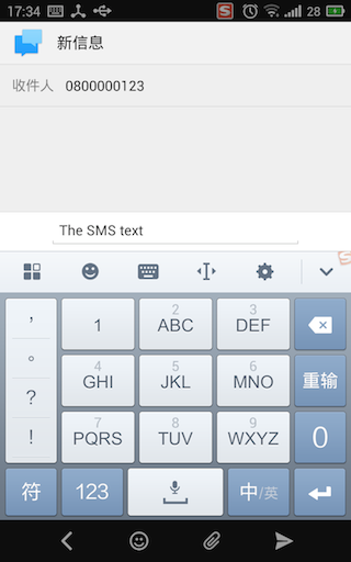 可以看到,我们通过shareIntent.clone方法拷贝了一个对象intent, 然后执行startActivity(intent), 随即就进入了短信页面,号码为0800000123,文本内容为The SMS text,即这些内容都与shareIntent一致。