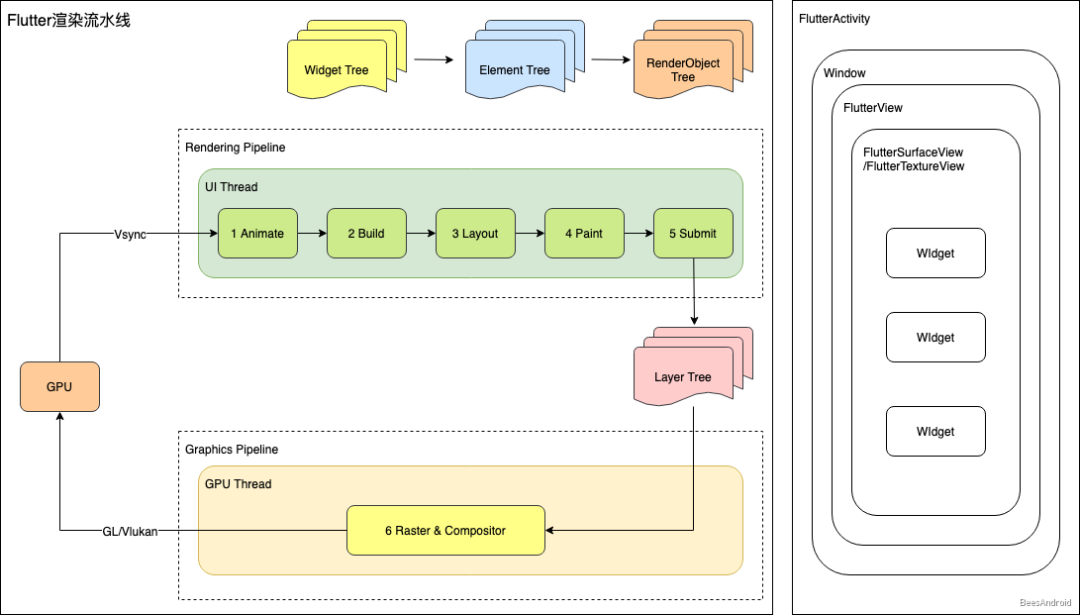 对应图中1-5,执行Dart VM中的Dart代码(包含应用程序和Flutter框架代码),主要负责Widget Tree、Element Tree、RenderObject Tree的构建,布局、以及绘制生成绘制指令,生成Layer Tree(保存绘制指令)等工作。