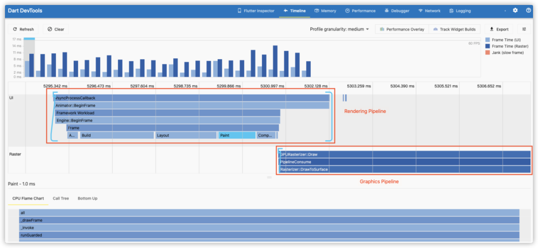 以上便是Flutter渲染的整体流程,会有多个线程配合,多个模块参与,抛开冗长的调用链,我们针对每一步来具体分析。我们在分析结构时把Flutter的渲染流程分为了7大步,Flutter的timeline也可以清晰地看到这些流程,如下所示: