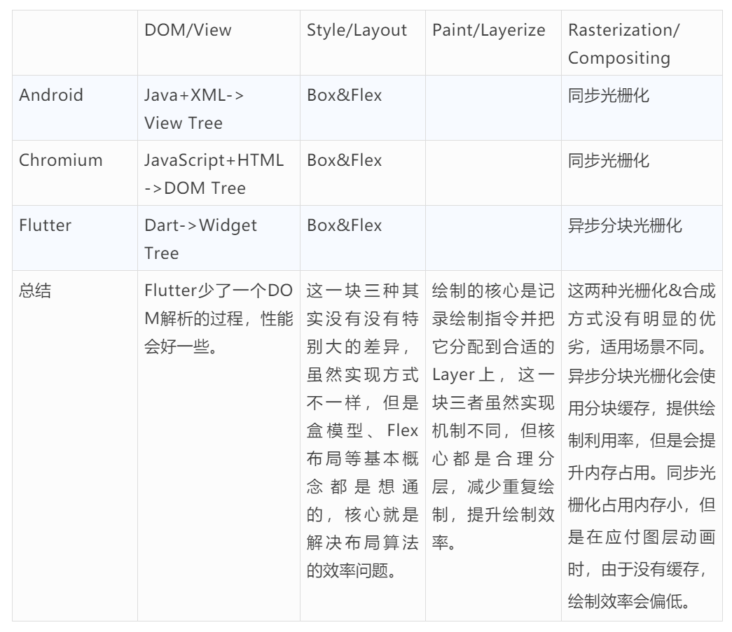 Android和Flutter采用同步光栅化策略,以直接光栅化为主,光栅化和合成同步执行,在合成的过程中完成光栅化。而Chromium采用异步分块光栅化测量,图层会进行分块,光栅化和合成异步执行。