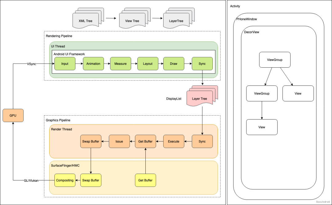 GPU Thread通过Skia向GPU绘制一帧数据,GPU将帧信息保存在FrameBuffer里,然后根据VSync信号周期性的从FrameBuffer取出帧数据交给显示器,从而显示出最终的界面。