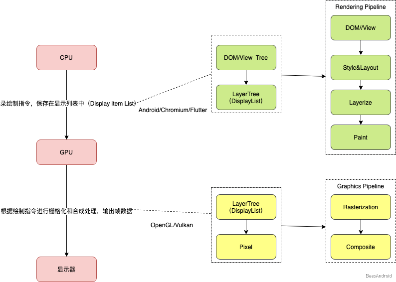 光栅化是把绘制指令转换成对应的像素数据,合成是把各图层栅格化后的数据进行相关的叠加和特性处理。这个流程称为Graphics Pipeline。