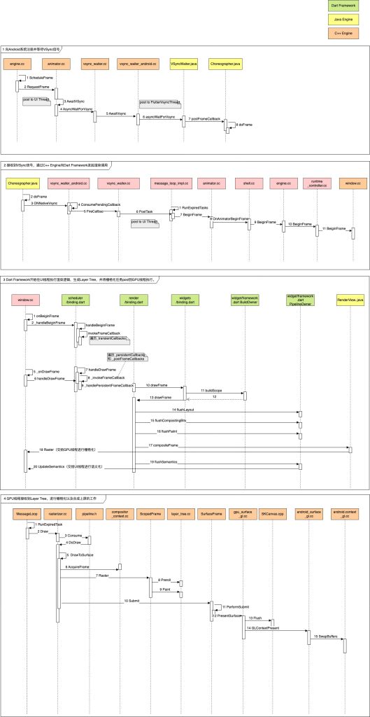 2)接收到VSync信号,通过C++ Engine向Dart Framework发起渲染调用