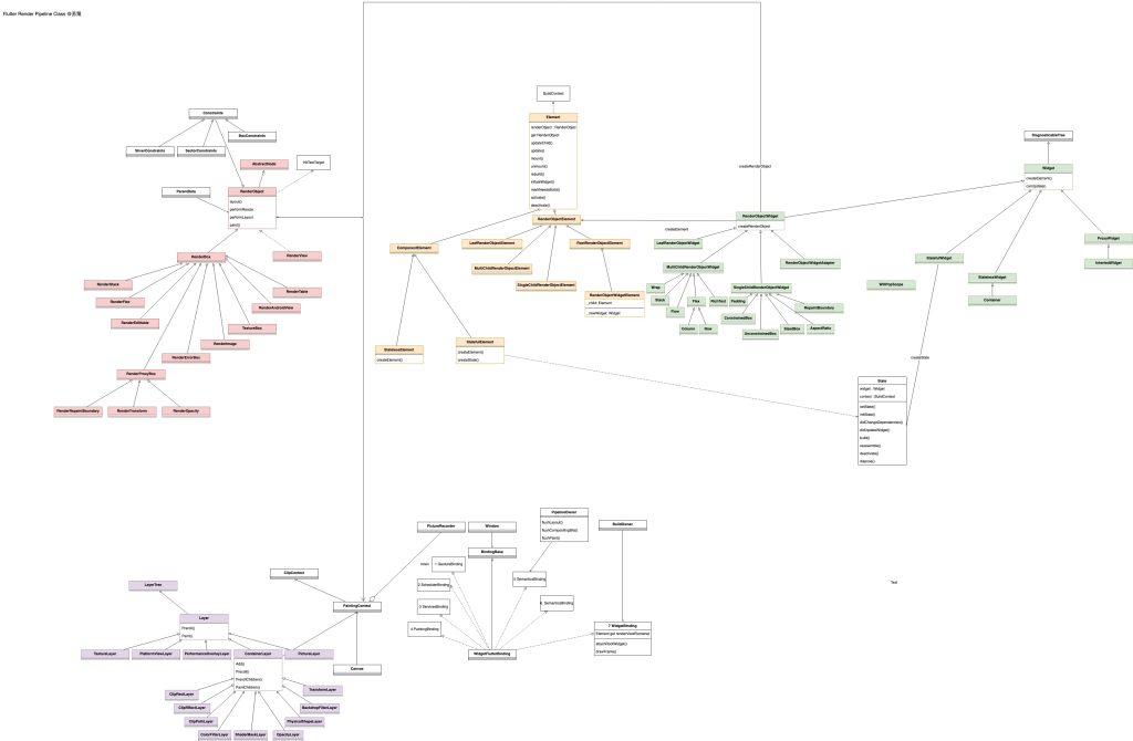 逐个调用流程比较长,但是核心点没多少,不用纠结调用链,抓住关键实现即可,我们把里面涉及到的一些主要类用颜色分了个类,对着这个类图,基本可以摸清Flutter的脉络。