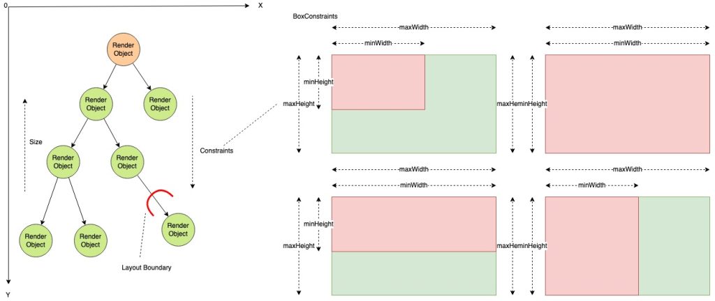 边界约束(Constraints):边界约束是父节点用来限制子节点的大小的一种方式,例如BoxConstraints、SliverConstraints等。