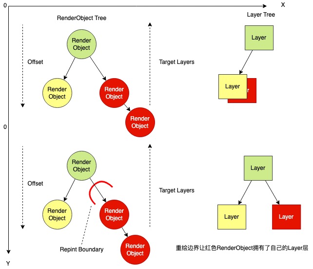 重新绘制边界(RepaintBoundary): 为一个子节点设置重新绘制边界,这样当它需要重新绘制时,不会导致父节点重新绘制,这是个标志位,在标记dirty的markNeedsPaint()方法中会检查这个标记位来决定是否重新进行重绘。