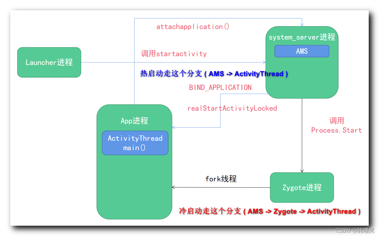 - 如果是冷启动 , 执行路线如下 : Launcher -> AMS -> Zygote -> ActivityThread ; 如果没有进程 , 首先要调用 Zygote 进程 , fork 一个新的进程 , 然后调用该进程对应的