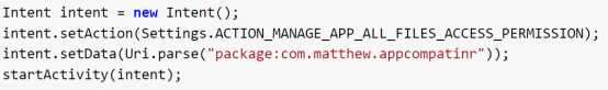 ■ 使用 ACTION_MANAGE_ALL_FILES_ACCESS_PERMISSION intent 操作将用户引导至一个系统设置页面,在该页面上,用户可以为您的应用启用以下选项:授予所有文件的管理权限。