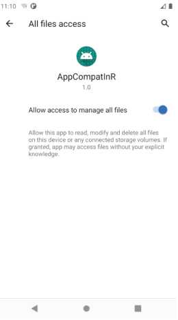 ● 使用 ACTION_MANAGE_ALL_FILES_ACCESS_PERMISSION intent 操作将用户引导至一个系统设置页面,在该页面上,用户可以为您的应用启用以下选项:授予所有文件的管理权限。
