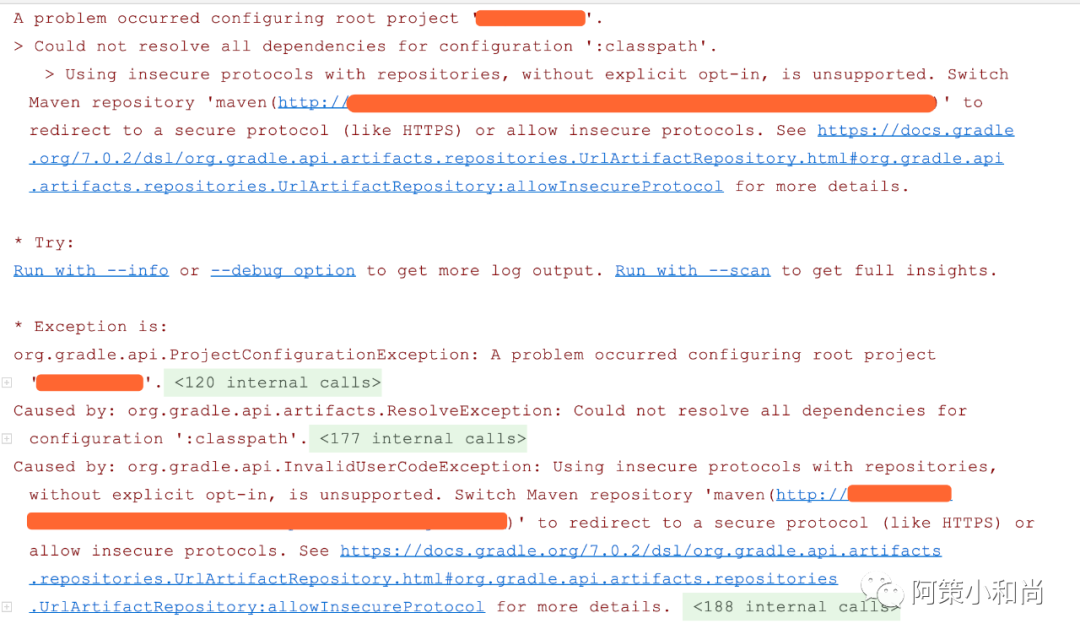 和尚历史项目中引入了很多公司内部仓库和部分非 Https 的线上库,在 Gradle 升级后,Marven 仓库建议使用 Https 安全的仓库;