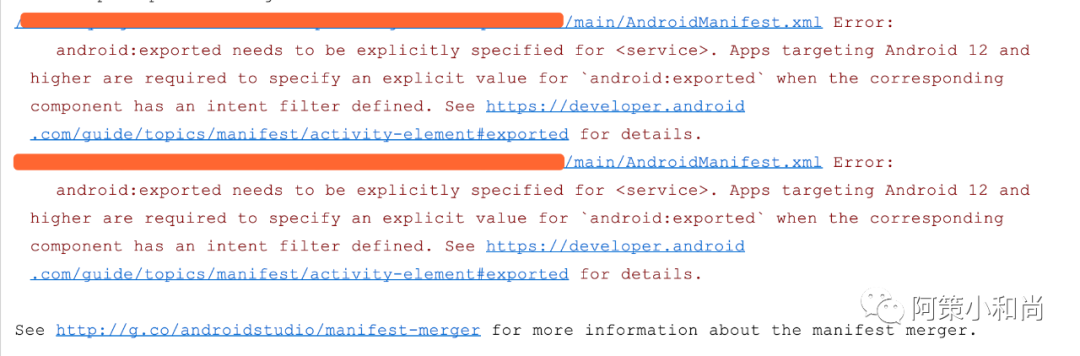 和尚在测试过程中,明明代码中所有涉及 intent-filter 过滤器的 Activity / Service / Receiver 都已经设置了 exported 属性,但依旧提示使用 Intent 过滤器的 XX 需设置 exported 属性;其原因在于引入了各类三方 SDK,在引入的各类三方库中可以存在对应的未设置 exported 属性的 Activity / Service / Receiver,单独设置处理一下即可;