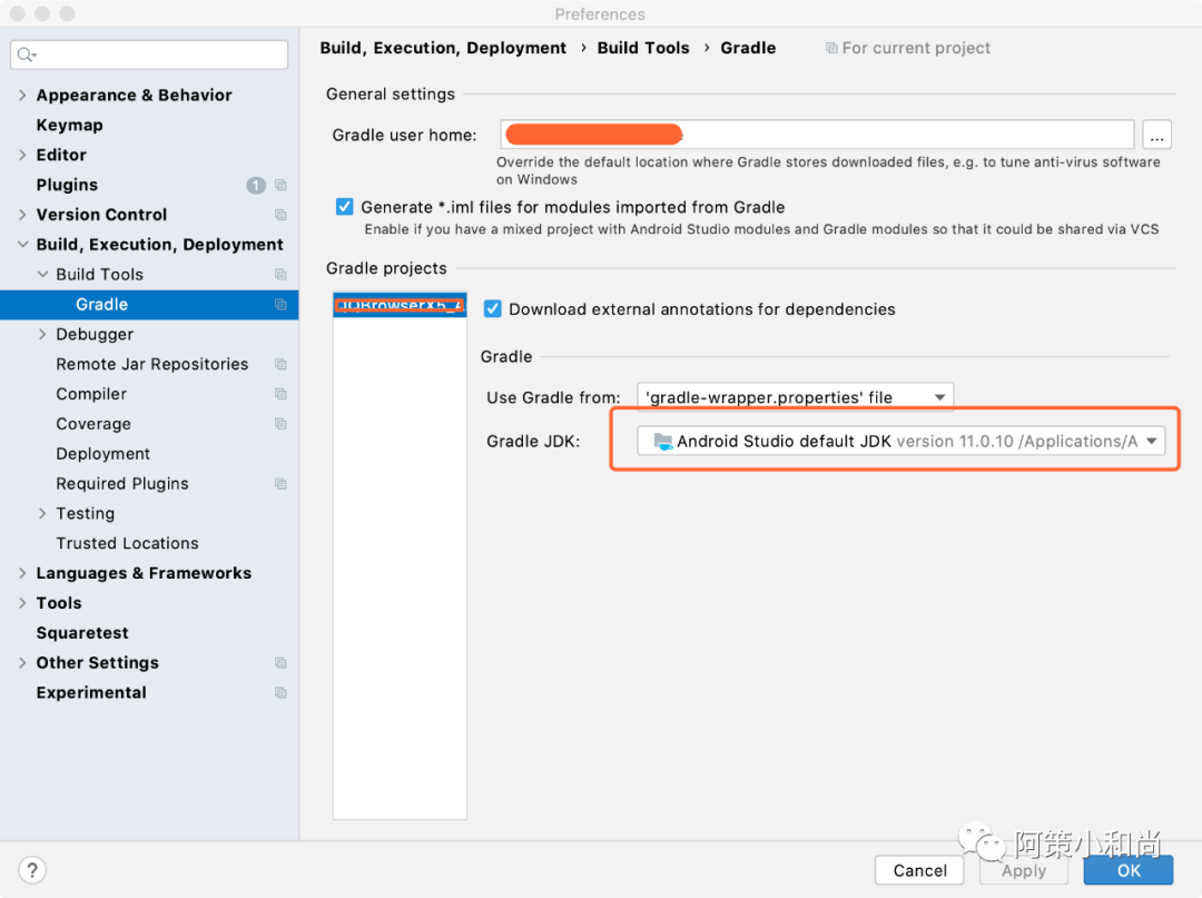 通过 AndroidStudio -> Preferences… -> Gradle 更新 jdk 版本即可;