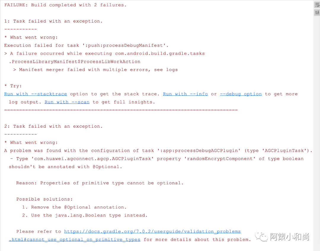 和尚的历史项目中使用了 Huawei HMS 推送等,使用的 Marven 库版本较低,与升级后的 Gradle 不兼容;