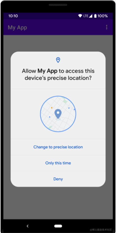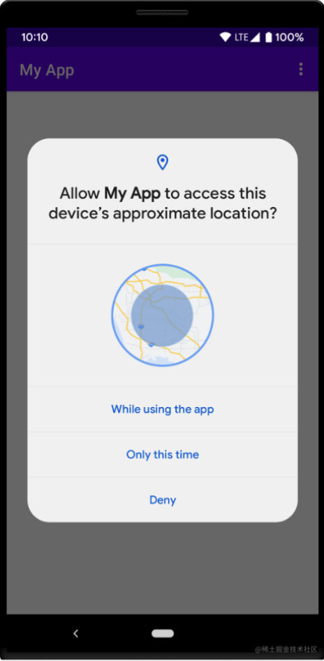 - 为了更好地尊重用户隐私,尽量只请求 ACCESS_COARSE_LOCATION 权限,因为粗略位置信息已经能满足大多数应用场景。仅请求 ACCESS_COARSE_LOCATION 权限时,授权弹窗只有一个选项: