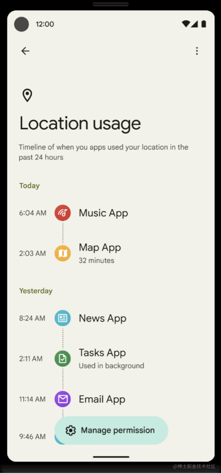 Android 12 系统在系统设置中引入了隐私信息中心功能,可以让用户更好地了解应用正在访问数据的行为。隐私信息中心以一个时间轴的方式显示过去时间内所有应用对于麦克风、摄像头或位置等敏感信息的访问情况。