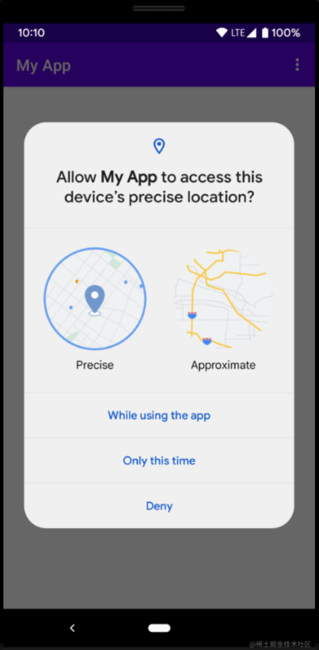 举个例子,我们通过以下代码请求 ACCESS_FINE_LOCATION 权限,在 Android 12 系统上的权限请求弹窗会给用户两个选项:Precise 精确位置 和 Approximate 粗略位置。如果用户选择授予粗略位置,那么最终应用获得的权限反而是 ACCESS_COARSE_LOCATION 权限,而不是一开始请求的 ACCESS_FINE_LOCATION 权限,并且应用也只能获取粗略位置信息。val locationPermissionRequest = registerForActivityResult( ActivityResultContracts.RequestPermission() ) { isGrant -> Log.i(“权限”,”isGrant: $isGrant”) if (PERMISSION_GRANTED == ActivityCompat.checkSelfPermission(this, Manifest.permission.ACCESS_COARSE_LOCATION)) { Log.i(“权限”, “ACCESS_COARSE_LOCATION is Grant”) } if (PERMISSION_GRANTED == ActivityCompat.checkSelfPermission(this, Manifest.permission.ACCESS_FINE_LOCATION)) { Log.i(“权限”, “ACCESS_FINE_LOCATION is Grant”) } } findViewById(R.id.tv).setOnClickListener { locationPermissionRequest.launch( Manifest.permission.ACCESS_FINE_LOCATION) } 复制代码