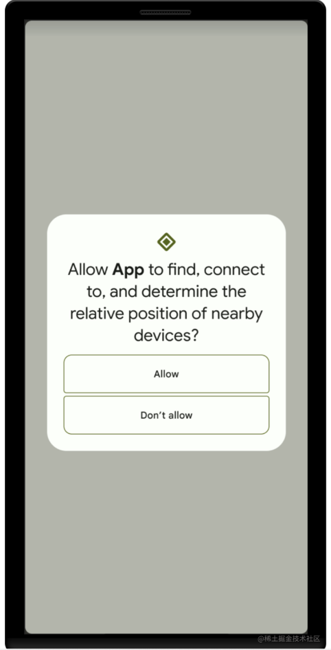另外,BLUETOOTH_SCAN 等权限是 NEARBY_DEVICES 附近设备权限组的一部分。请求该权限组的权限,权限授予对话框会提示用户批准访问附近的设备。