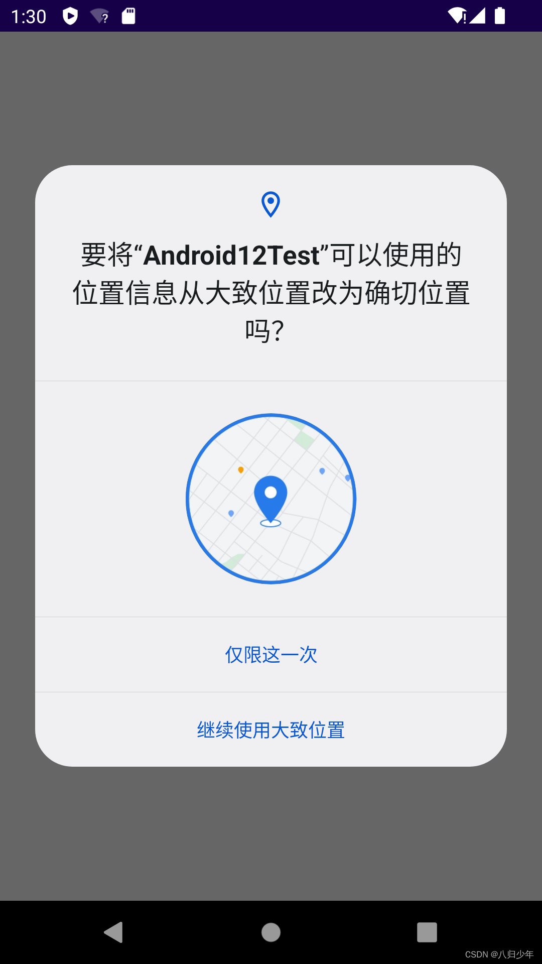 在以Android 12 系统的APP上,请求ACCESS_FINE_LOCATION权限时,系统权限对话框会提供两个选项,即允许App获取确切位置,还是仅允许获取大致位置。