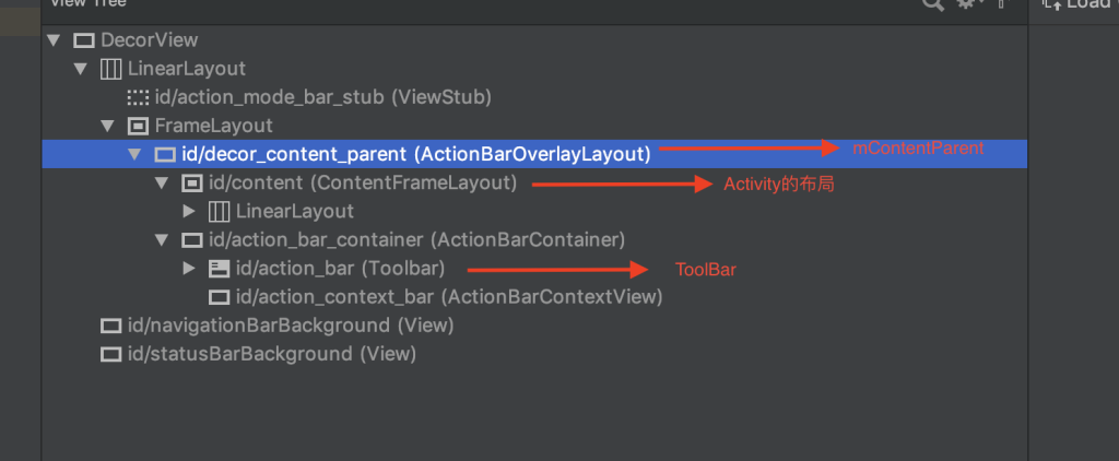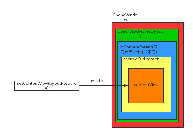 PhoneWindow里存在一个DecorView(mDecor)成员变量,可以把它理解为一个FrameLayout,它包含一个mContentParent的子View, mContentParent是Activity的根布局contentView的父View