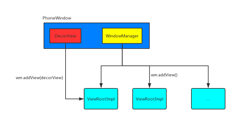 Window可以有多个子View,每个子View都对应一个ViewRootImpl。 ViewRootImpl会通过IPC来与WindowManagerService交互,来实现View的显示