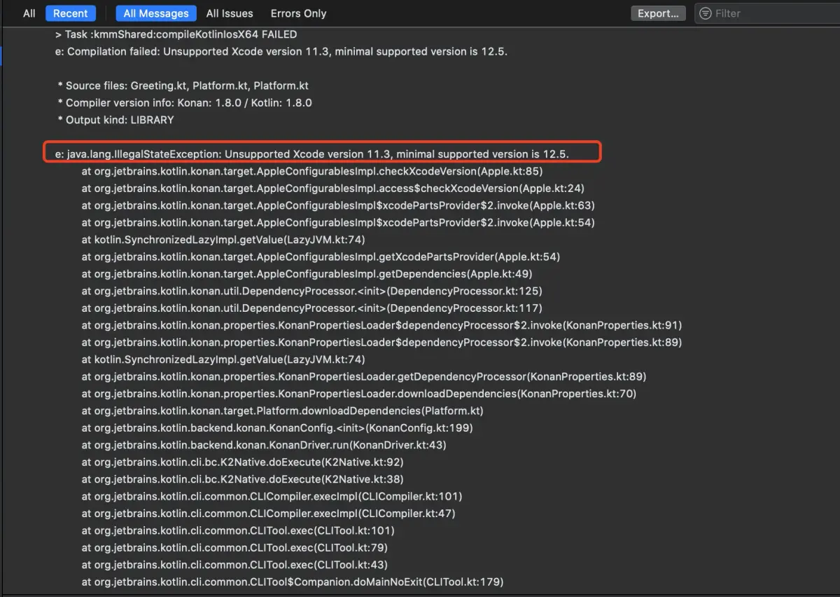 KMM 对 Xcode 的版本要求,需安装符合版本的 Xcode,如果安装符合版本的 Xcode,可能还需要升级你的 macOS 系统。