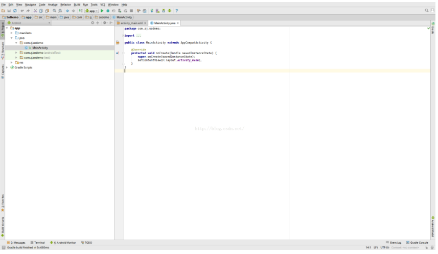 首先你需要先生成MainActivity.java的class文件,点击菜单栏build->Make Project(快捷键Ctrl + F9)即可编译整个工程。编译完成后,在路径app/build/intermediates/classes/debug/com/zj/sodemo下应该会出现MainActivity.class文件