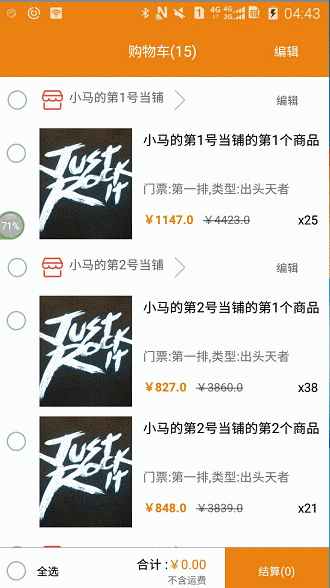 整一个布局就是ExpandableListView,然后自定义一个ActionBar,ActionBar上面显示购物车数量,通过ActionBar上面的编辑状态,店铺布局,所有商品布局,底部布局要进行相应的变化,编辑状态下需要改变商品的数量,删除商品,全选商品,隐藏店铺的编辑。非编辑状态可以显示店铺的编辑,显示结算,商品的信息。通过每一个店铺上面的编辑状态,该店铺旗下的所有商品布局都要进行相应的变化。编辑状态下,需要改变商品的数量和删除商品。非编辑状态下只需要显示商品的信息。当该店铺下所有商品都被勾选,对应的店铺也要被勾选。反之,该店铺下只要有一个商品没有被勾选,那么店铺就不用勾选。其实逻辑挺简单的,复杂的逻辑其实就是很多简单逻辑组成的,我们只需要把复杂的逻辑简单化成很多简单的逻辑,我们就能完成一个大概的思路