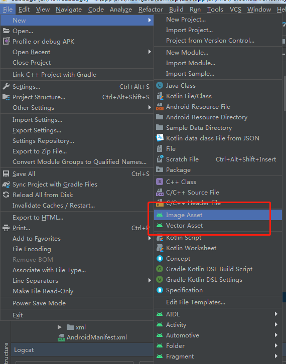 打开android studio 点击新建 这里有image asset 和vector asset